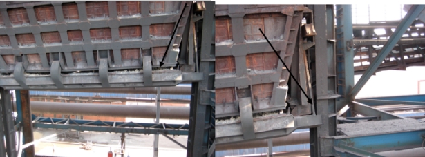 倾斜的焦罐及敞开的底闸门 被卡掉的焦罐底部导向轮