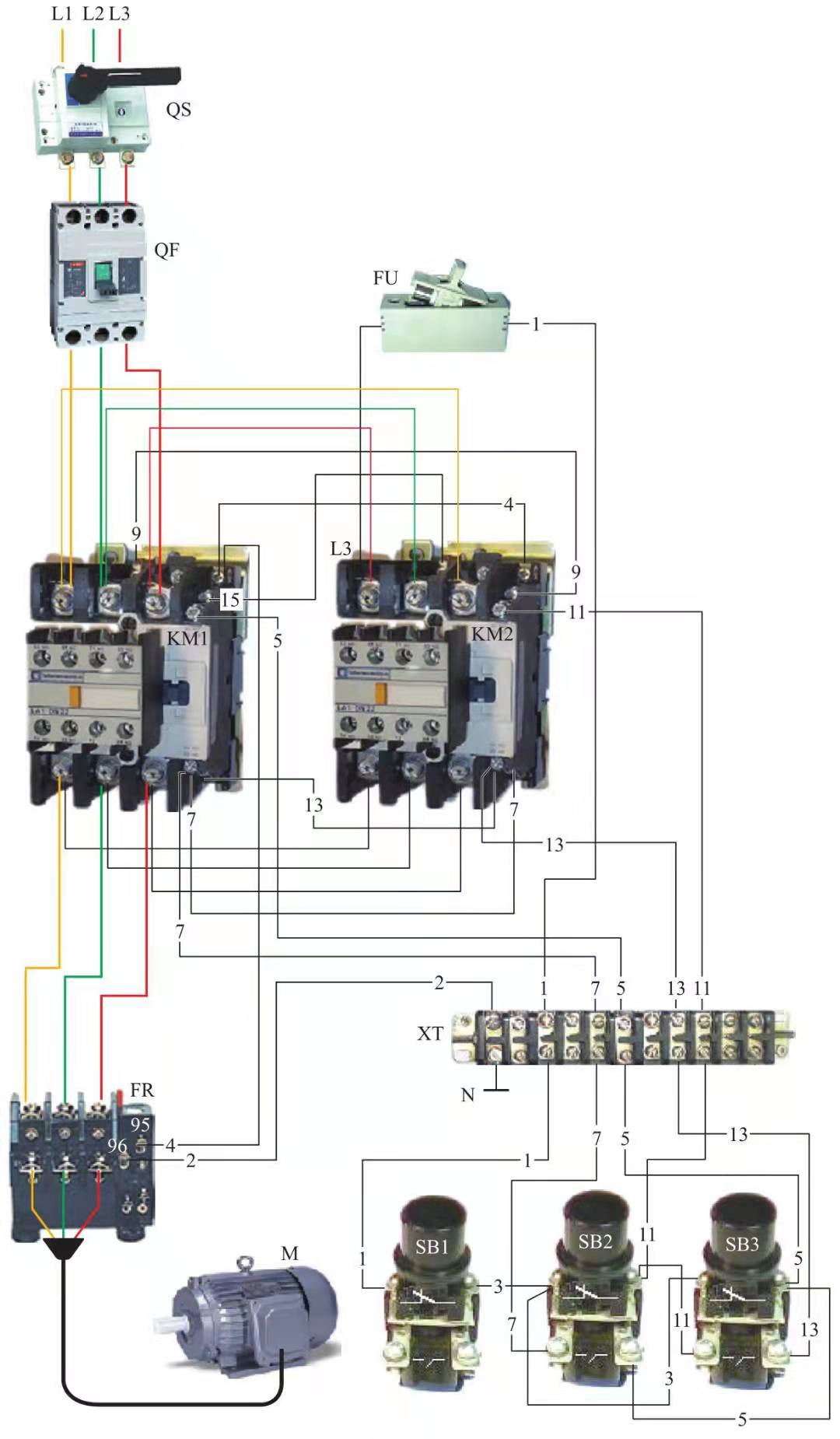 按下正向启动按钮SB2,电源L3相→控制回路熔断器FU→1号线→停止按钮SB1动断触点→3号线→按钮SB3动断触点→5号线→启动按钮SB2动合触点(按下时闭合中)→7号线→反向接触器KM2动断触点→9号线→正向接触器KM1线圈→4号线→热继电器FR动断触点→2号线→电源N极。电路接通,接触器KM1线圈获220V电压动作。动合触点KM1闭合自保。主回路中正向接触器KM1三个主触点同时闭合,电动机M绕组获得按L1、L2、L3排列的三相380V交流电源,电动机正向运转。